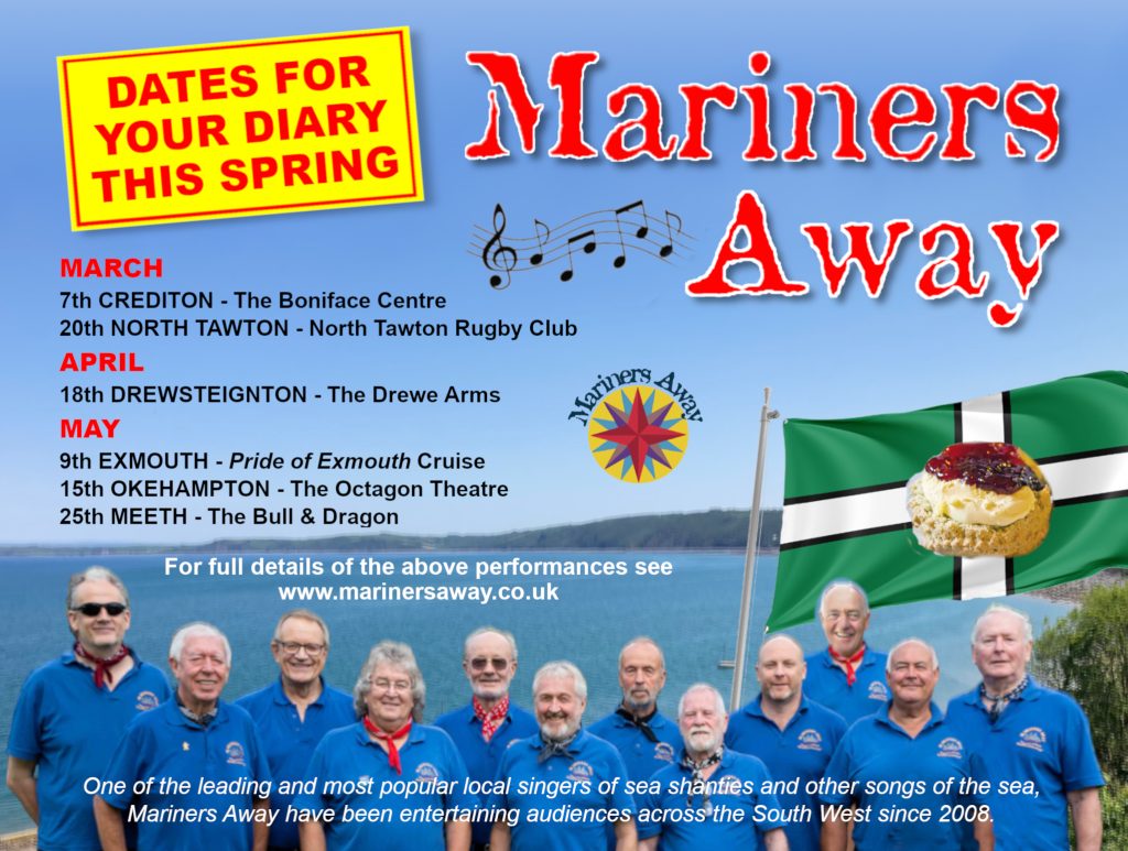 Mariners Away are looking forward to performing in Drewsteignton, Okehampton, Bow, Jacobstowe, South Zeal and Exbourne – for dates and details and our full performance schedule in 2026 visit https://marinersaway.co.uk/2026-2/